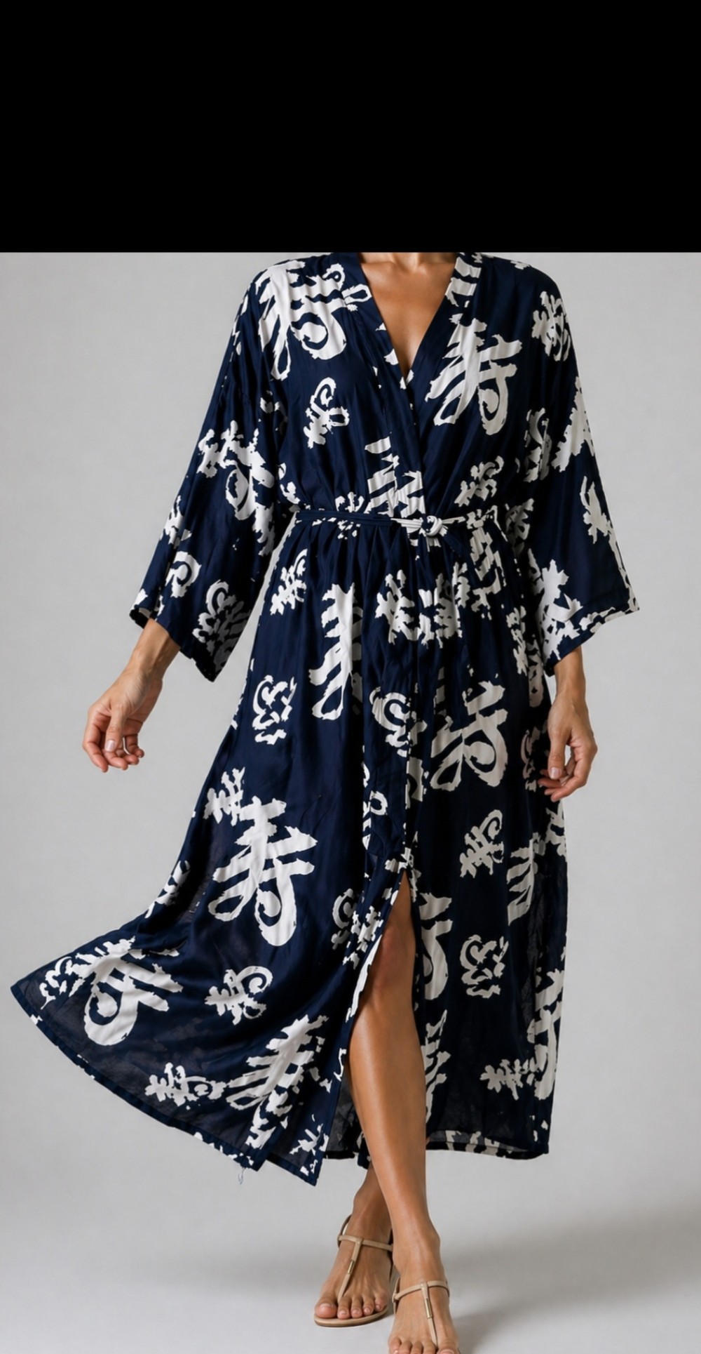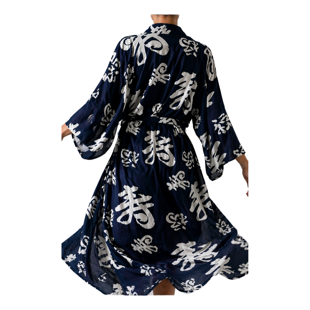 Dark blue kimono-style dress with white hieroglyph pattern. The dress has a belt at the waist.