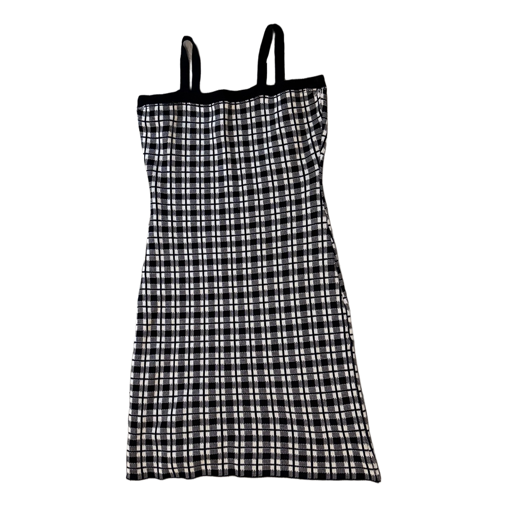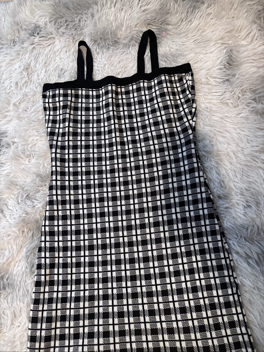 Sleeveless knitted midi dress with a black and white plaid pattern.