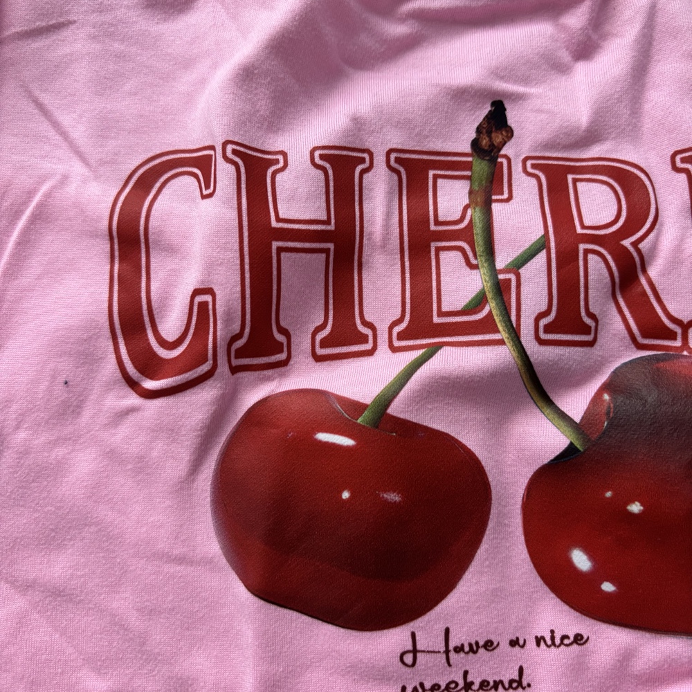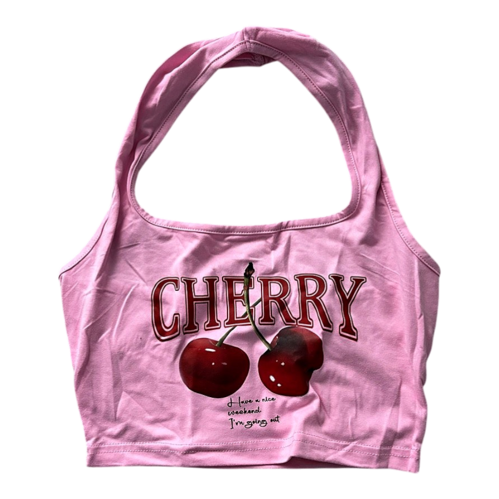 Pink halter neck crop top. Features a red "Cherry" graphic print on the front. Text "I have a nice weekend" is visible below the graphic.