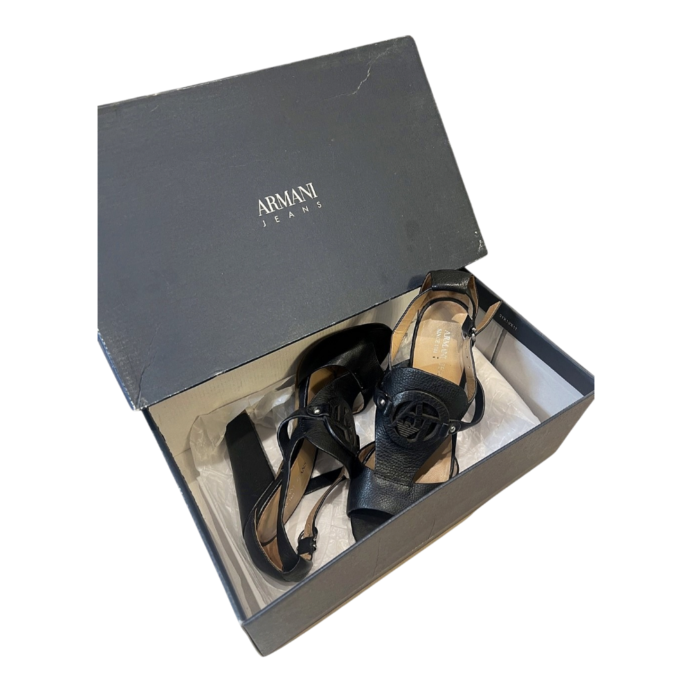 Armani Jeans high heel sandals in black. Featuring logo detailing and an adjustable ankle strap.