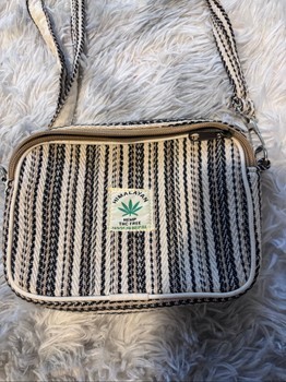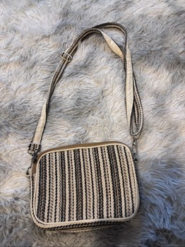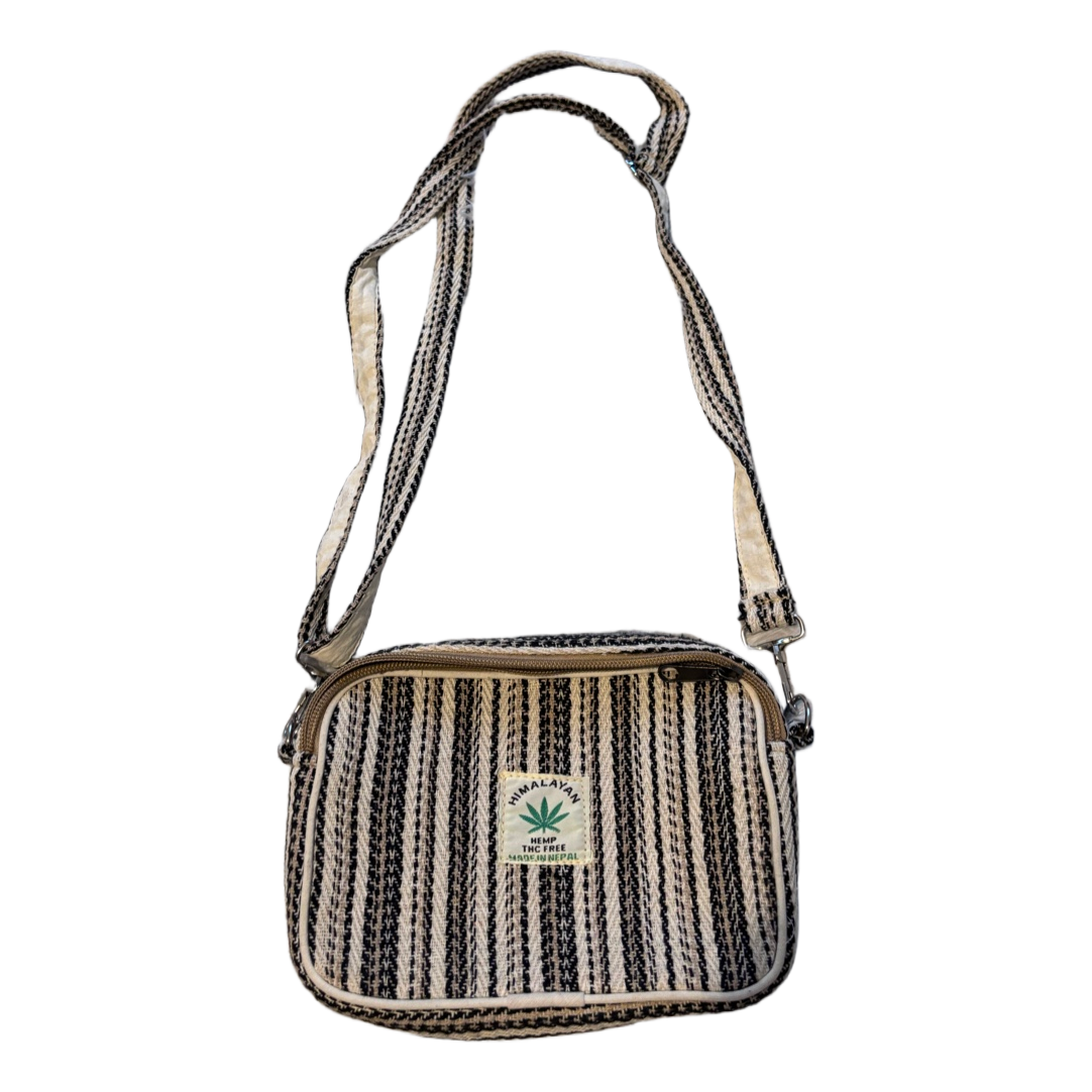 Small striped crossbody bag made of hemp fiber. Features a top zipper closure and an adjustable shoulder strap.