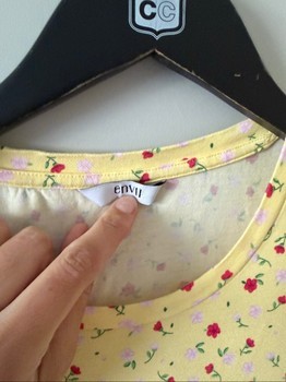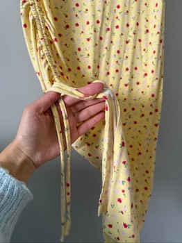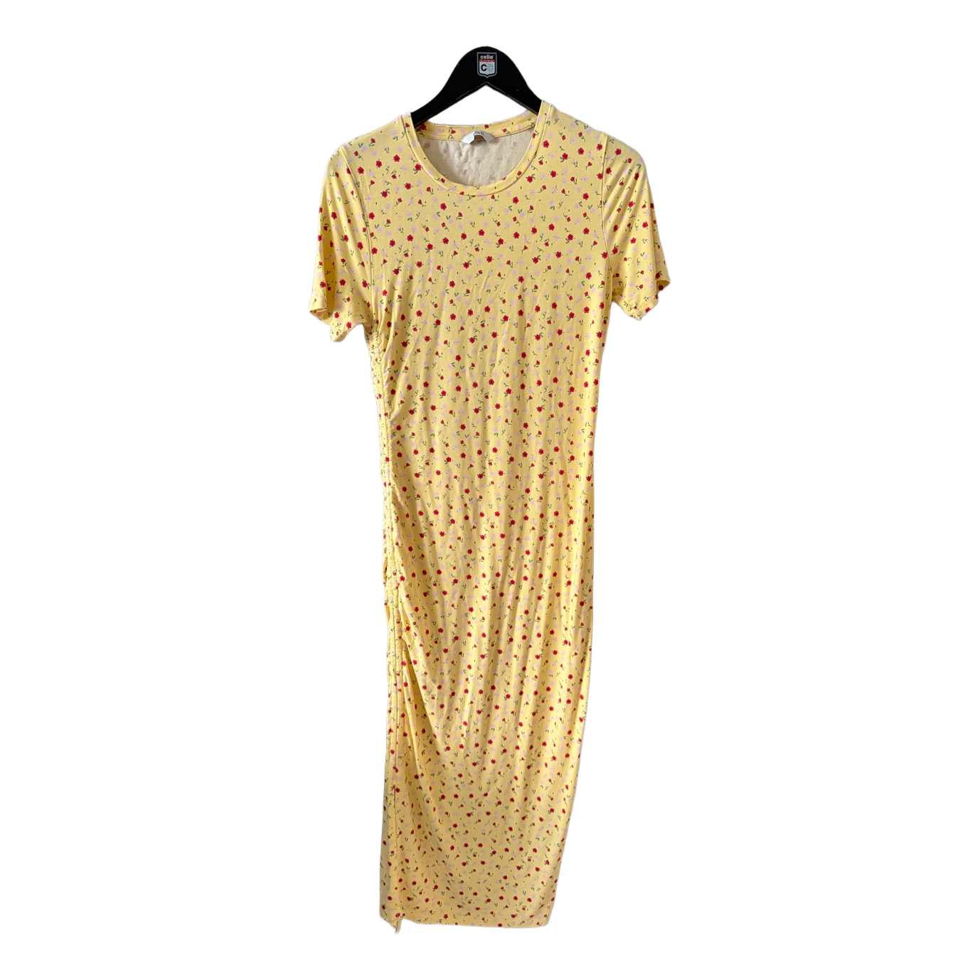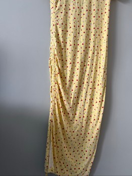 Yellow midi dress with small floral pattern. Features side ruching with a drawstring tie and a small side slit. Size L.