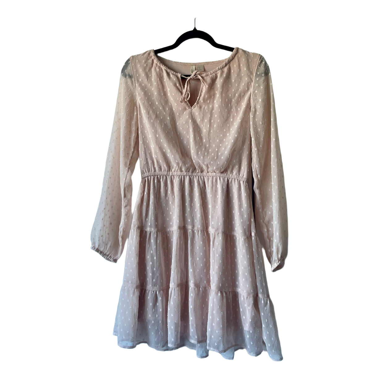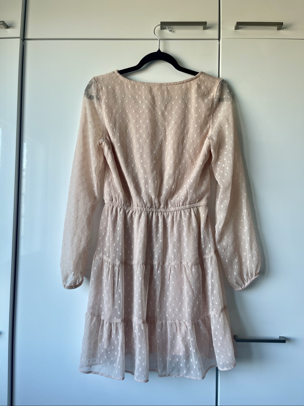 Long-sleeved dress with elastic at the waist and a tieable neckline.