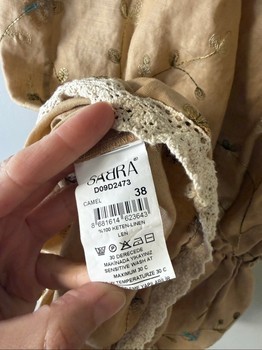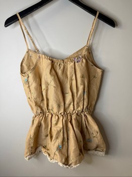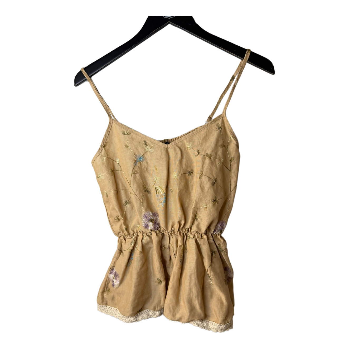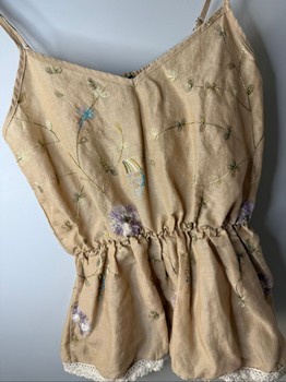 Beige top with floral embroidery and lace trim at the hem. Features an elasticated waist and adjustable straps. Made of 100% linen, size 38.
