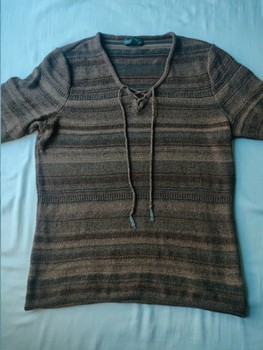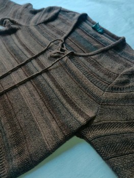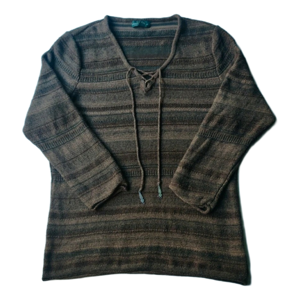Lovely 90s knitted sweater, with earthy brown shades and textured stripe pattern. Bohemian drawstring detail at the neckline, 3/4 sleeves.