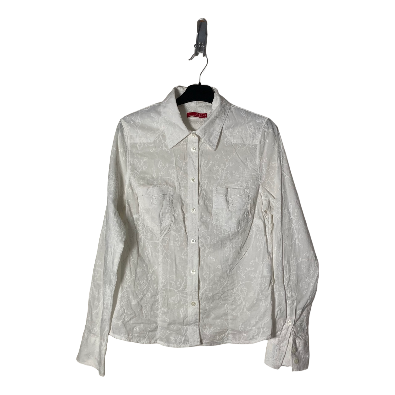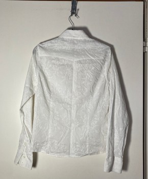 Very beautiful white collared shirt. The fabric has plant-themed sewn/embroidered patterns. Front button placket and buttons. Two chest pockets with cord decorations. Sleeve openings with slits and cuffs with three buttons. Shirt collar. In excellent condition. Slightly sheer cotton. Size 40. Fitted model. Pit-to-pit measurement about 49 cm. Length about 66 cm. Pickup available from Helsinki. Also for sale elsewhere.