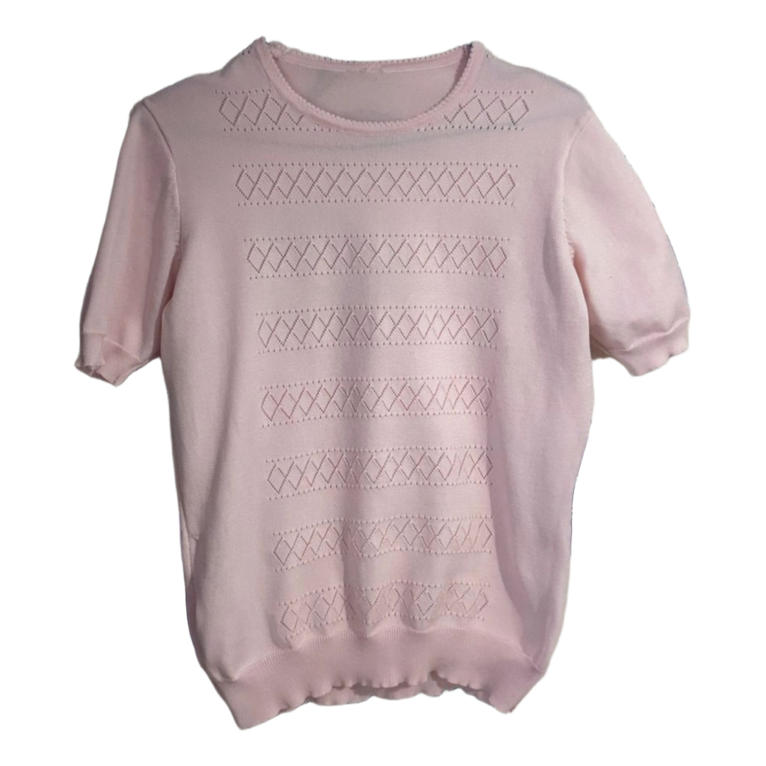 Short sleeve pink knit sweater with a patterned front featuring horizontal diamond cutouts.