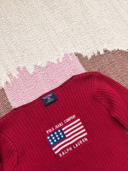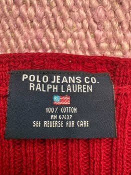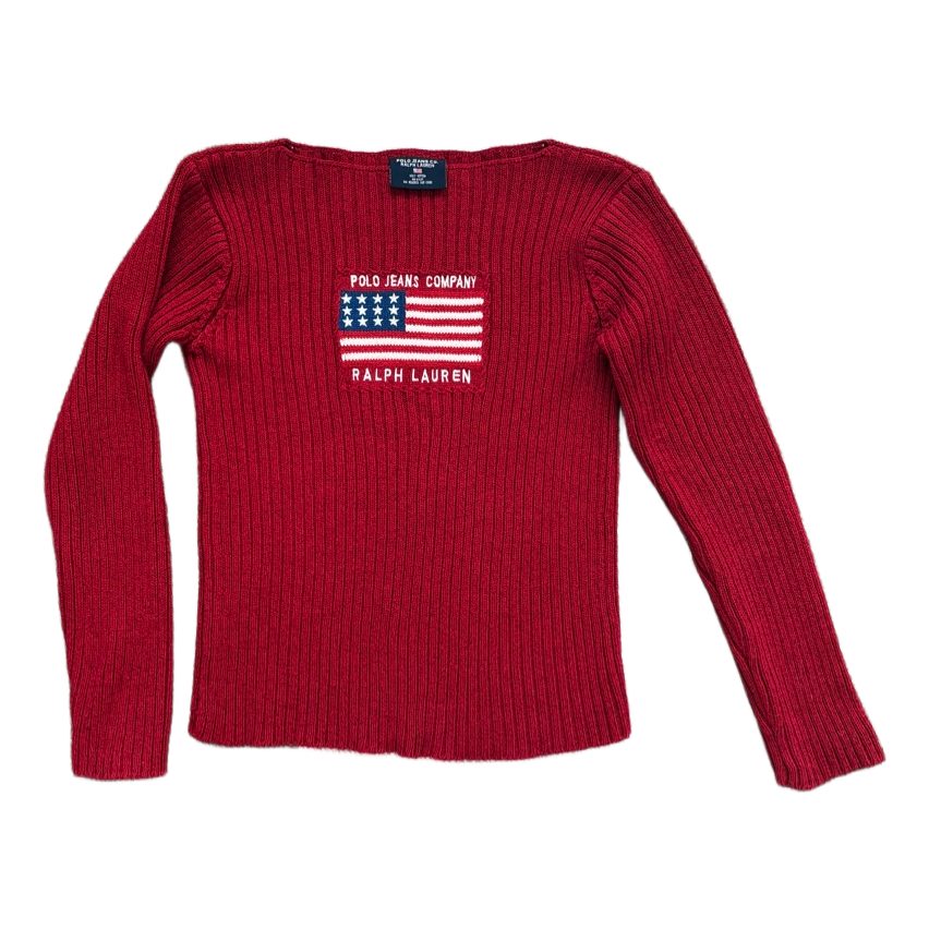 Polo Jeans Ralph Lauren red vintage knit sweater. Older collection, no size label but fits approx S/XS. Boat-style high neckline. Good condition for its age, normal signs of wear. Shoulder-to-hem approx 51 cm and armpit-to-armpit approx 42 cm. Color in real life slightly darker.