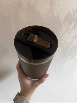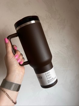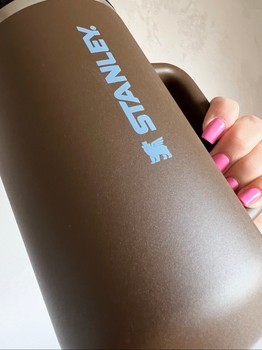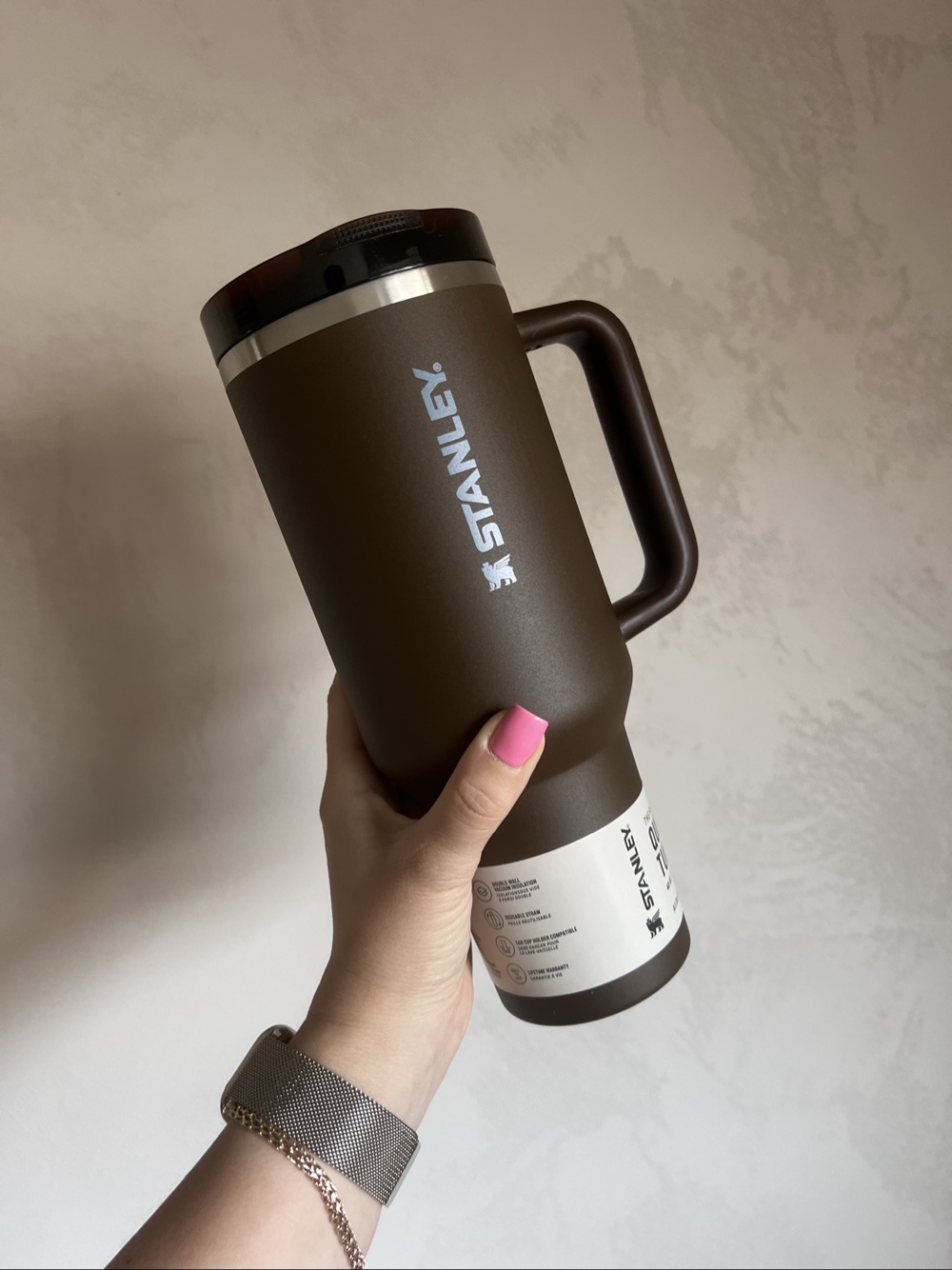 Stanley travel tumbler in brown. Includes handle and lid with straw opening. Features vacuum insulation for hot and cold drinks. New with original product tag. 1.18l.