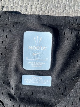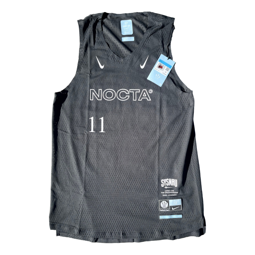 Black basketball jersey from the Nocta Nike collaboration. Features graphic detailing and white text on front and back. Size M, new with tags.