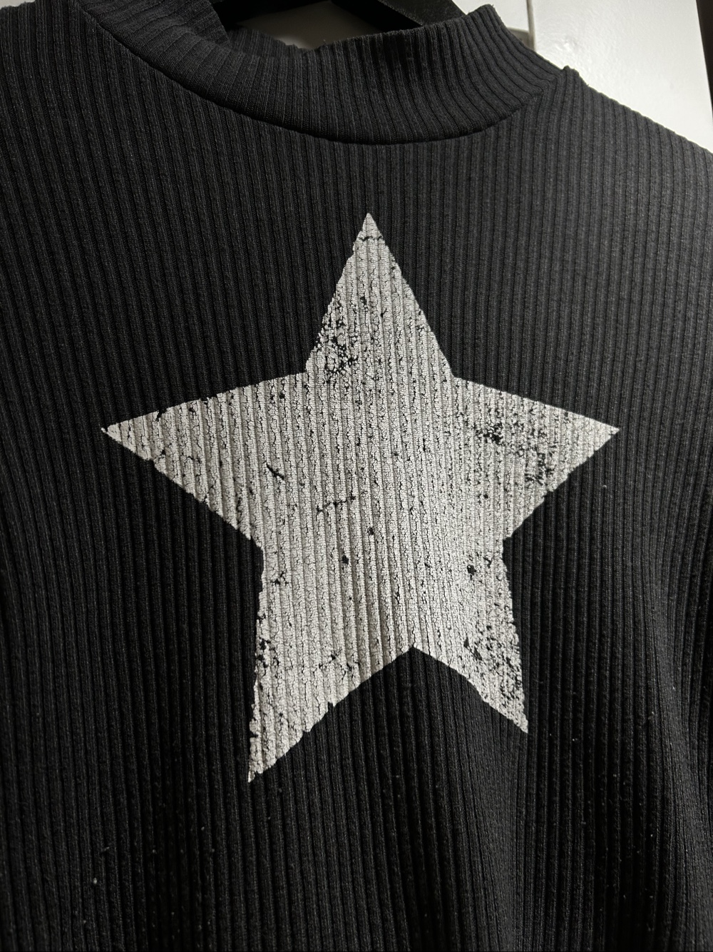 Black ribbed long-sleeved top featuring a distressed white star print. The bottom hem has a split design.