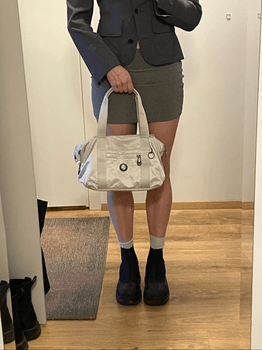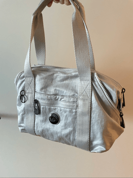Transformer bag in sparkle white with dual handles. Features an exterior zip pocket and a main compartment with a zipper.