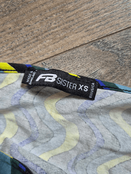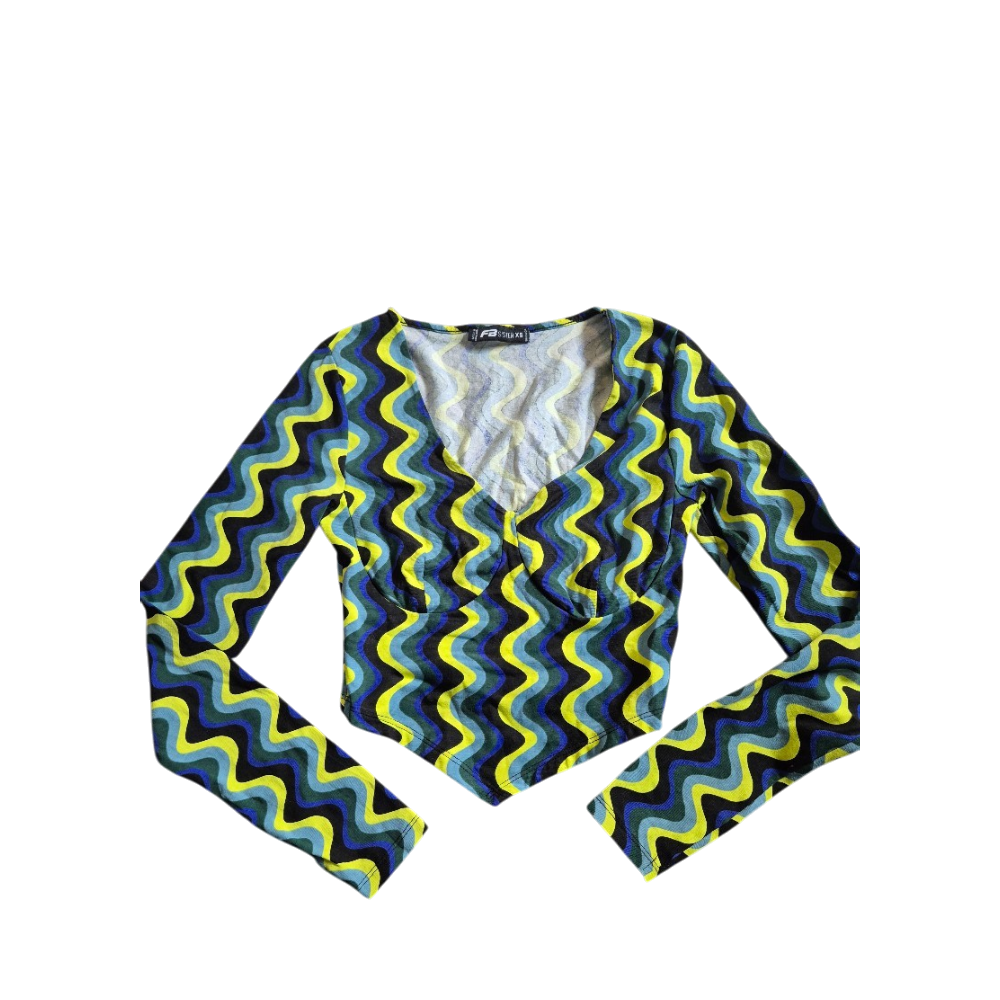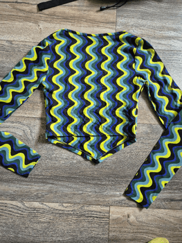 Colorful wavy pattern, V-neckline, crop top, size XS, true to size, has hardly any stretch. Used maybe once. FBSisters