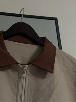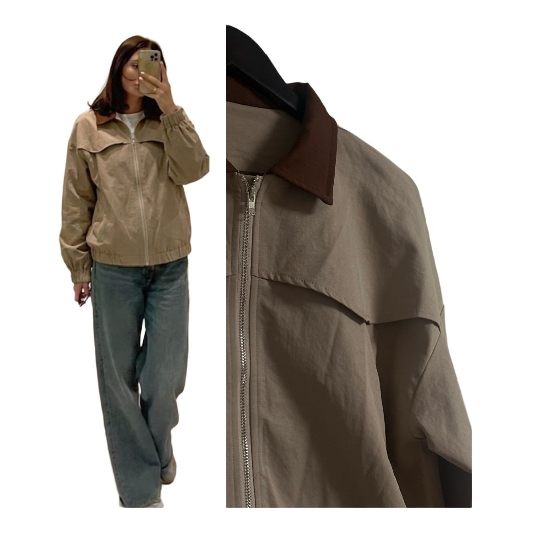 Beige jacket with a brown contrast collar. Features a full zip closure and elasticated cuffs and hem.
