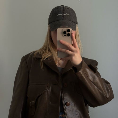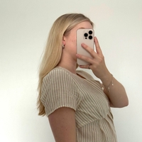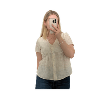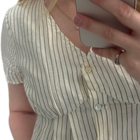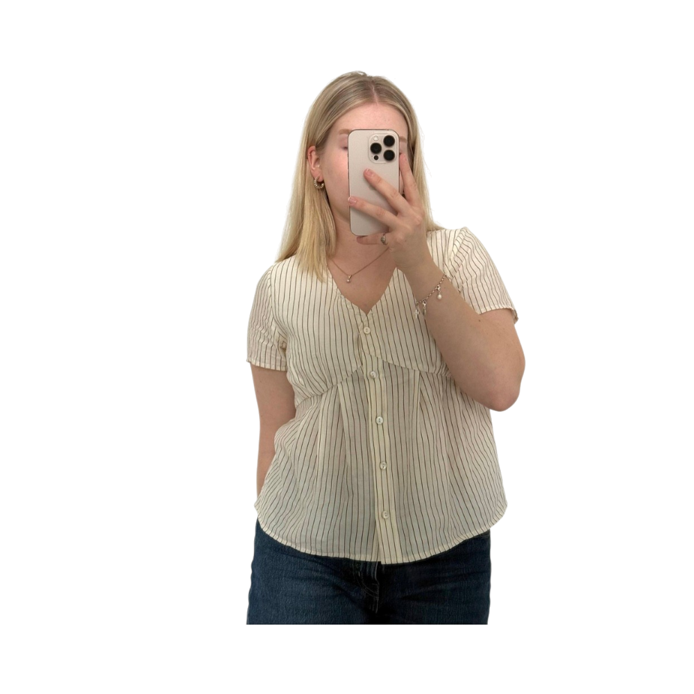 Lightweight cream blouse with vertical brown pinstripes, button front.
