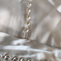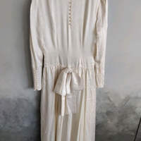 Ihana yksinkertainen vintage häämekko. Kauniit yksityiskohdat, selässä ja hihoissa pienet napit. Takana iso rusetti. Todella kaunis väri, kerman/hennon vaaleanpunainen sävy. Kauniisti hohtavaa silkkisen sileää materiaalia. Kiinteä alushame jossa röyhelöhelma. Sivussa vetoketju. Kunto erinomainen, ainoastaan napeissa kulumaa (suurimmasta osasta lähtenyt päältä helmiäiskerros) S/XS koko? Kai-kai 43 cm, pituus 136 cm, vyötärön leveys 37 cm. #vintage #vintagestyle #weddingdress #wedding