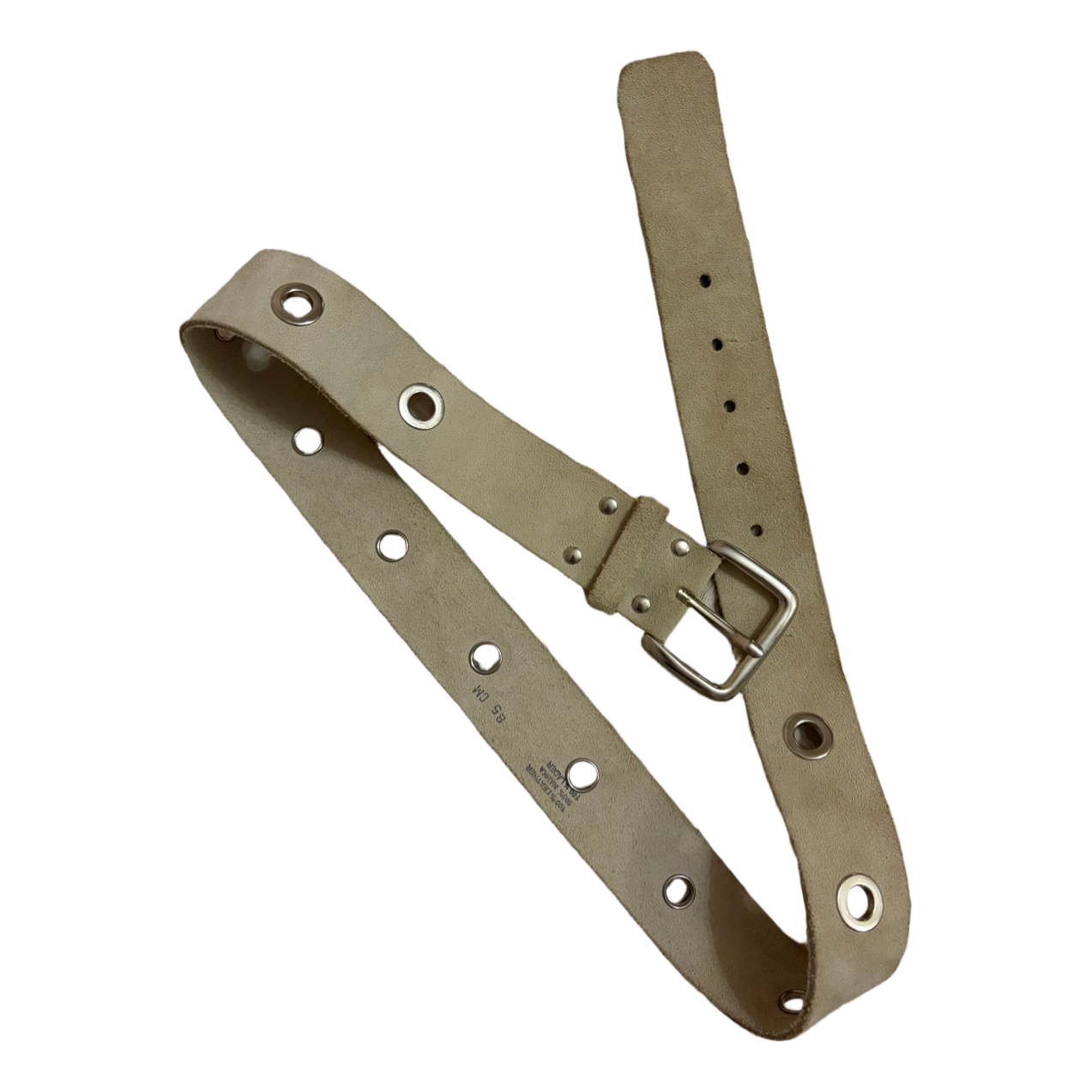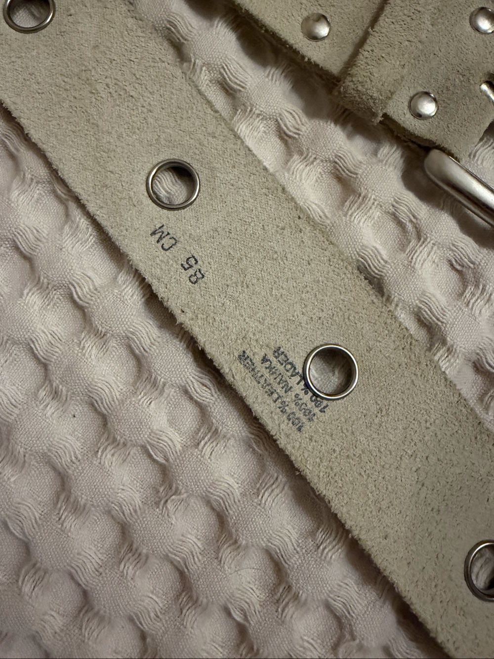 Beige suede leather belt featuring silver-toned eyelets and a metal buckle. Length: 85 cm.