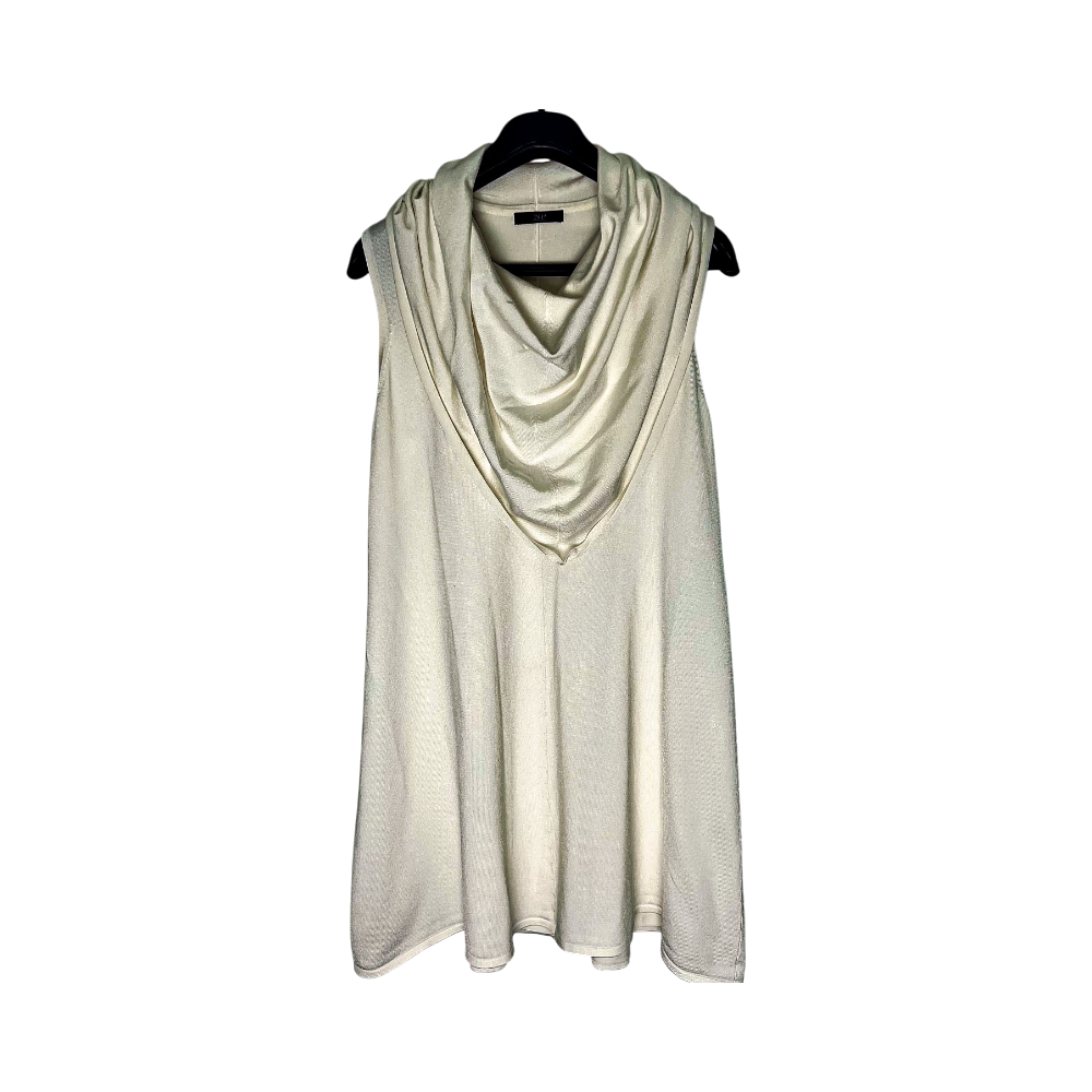 Like-new scarf-collar sleeveless stretchy A-line NP tunic. Size/material/wash-care tags removed, but I would guess the material is maybe viscose knit (?). Size probably XL-XXL. Length neck-seam to hem 83 cm, shoulder width 35 cm, width at armpit 55 cm (stretches to max 70 cm), hem width 85 cm. Neck opening width approx. 28 cm, collar length 48 cm, collar “hem” width approx. 70 cm.