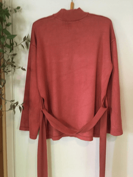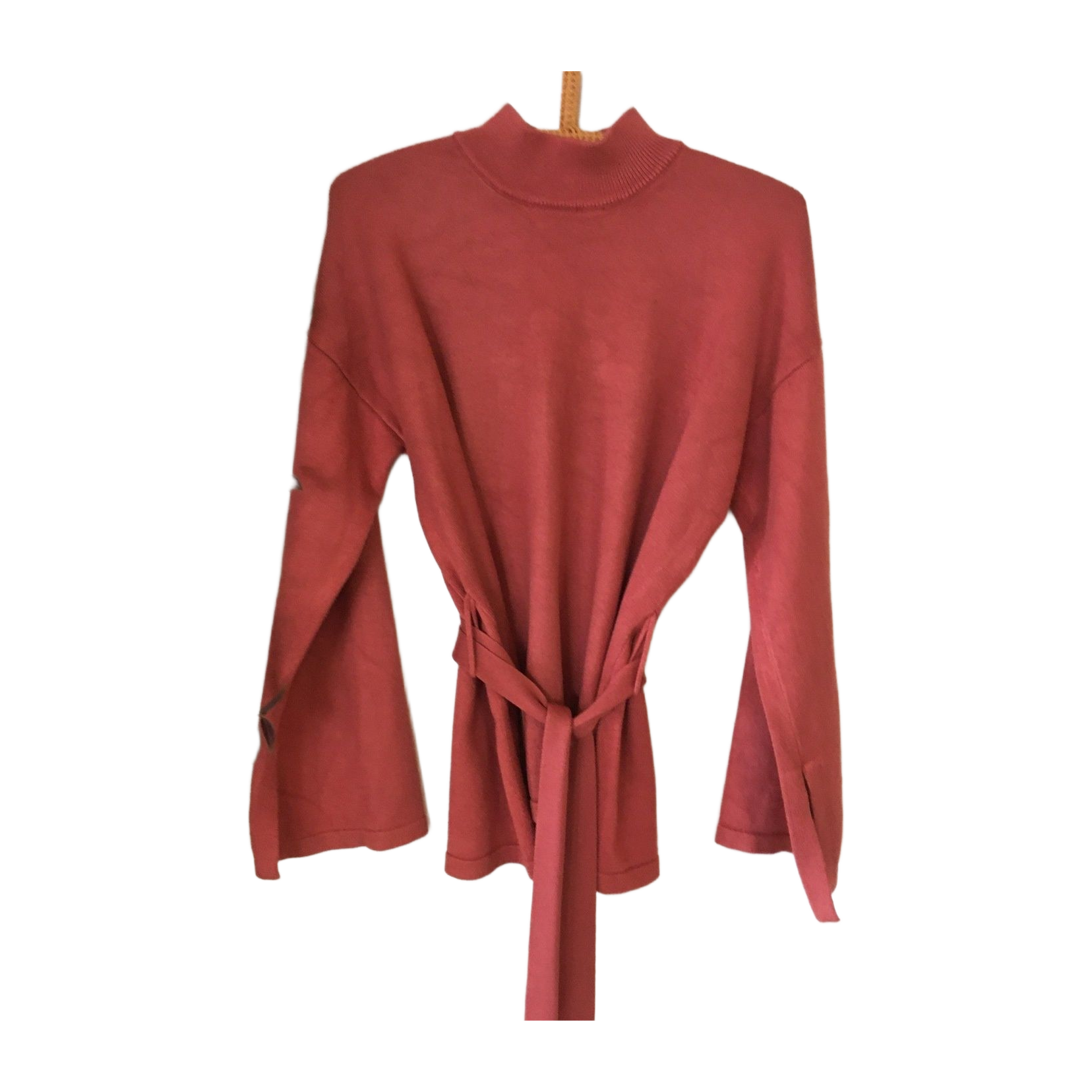 Turtleneck knit sweater with a belt cord tightening at the waist. Wide kimono-style cuffs. Color soft muted orange (shows best in the first and last photo).