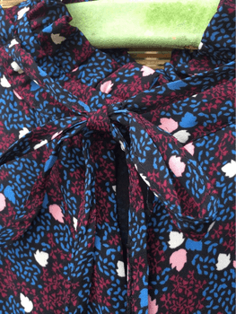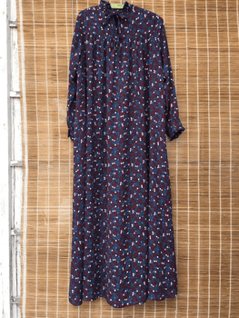 Long, high-necked, beautifully draping dress. The fabric feels high-quality and smooth. No signs of wear. Size is marked 40, and although otherwise it is a very loose model, it is too small for me at the shoulders.