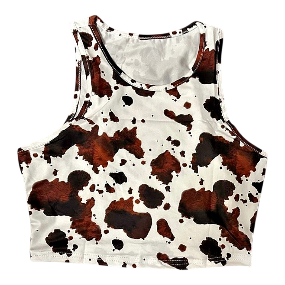 Sleeveless crop top with a brown and white cow print pattern.