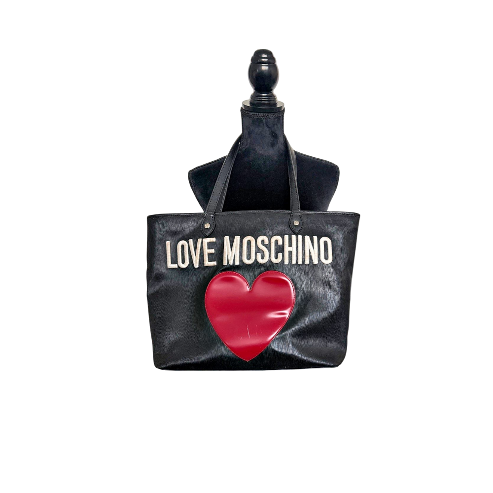 Black tote bag featuring a large red heart appliqué on the front. It has 'LOVE MOSCHINO' written in white letters and two top handles.