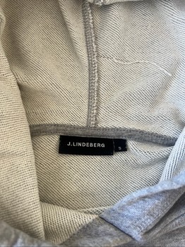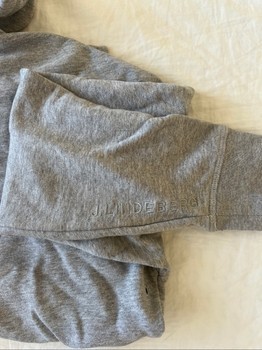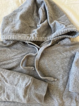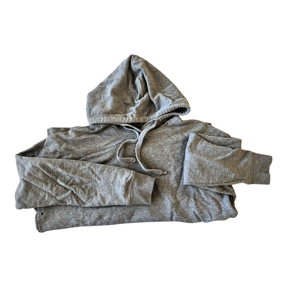 Grey hoodie with drawstrings in the hood. Embroidered text on the sleeve. Size S.