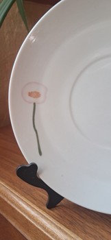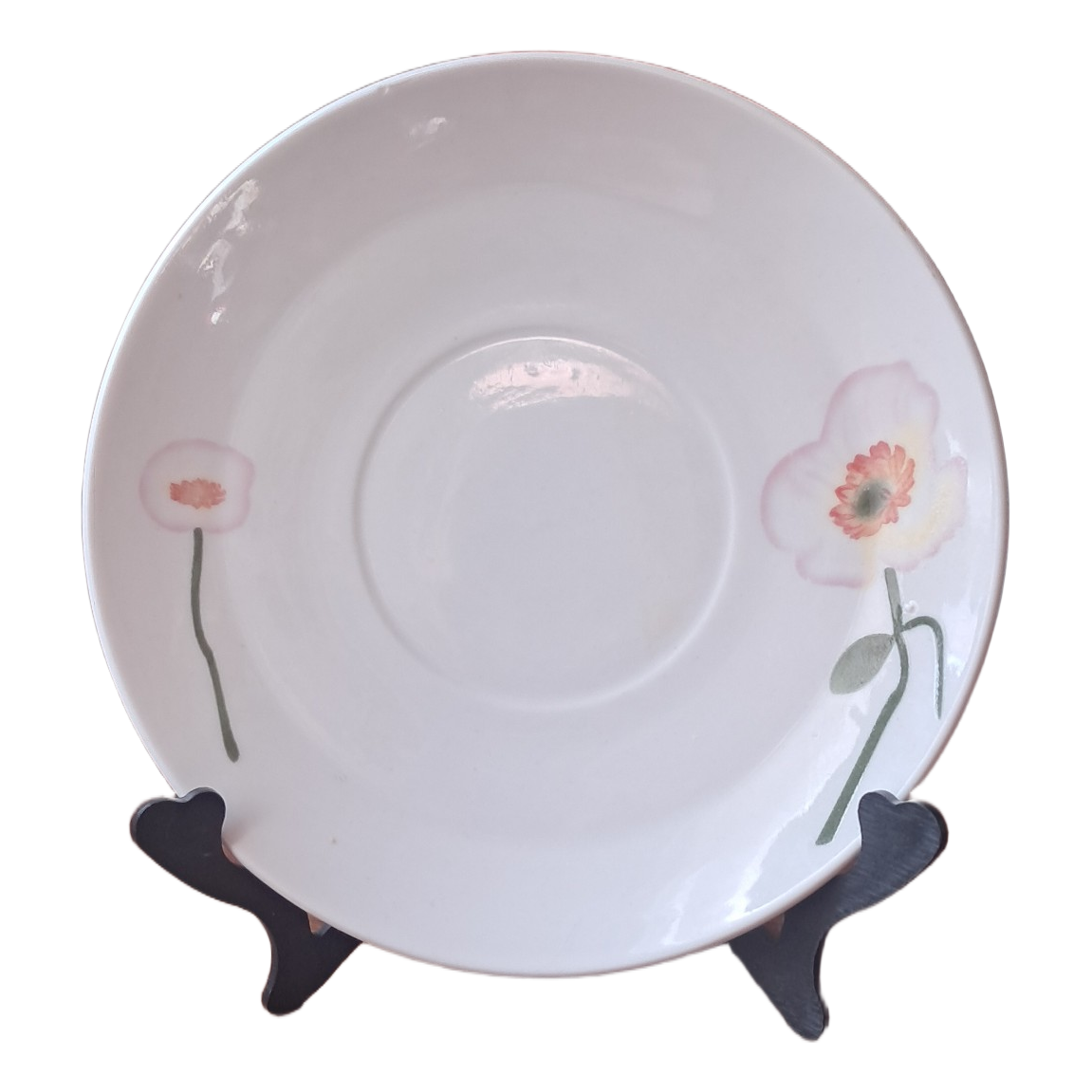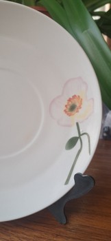 White ceramic saucer featuring a painted floral design. Measures approximately 15 cm in diameter.