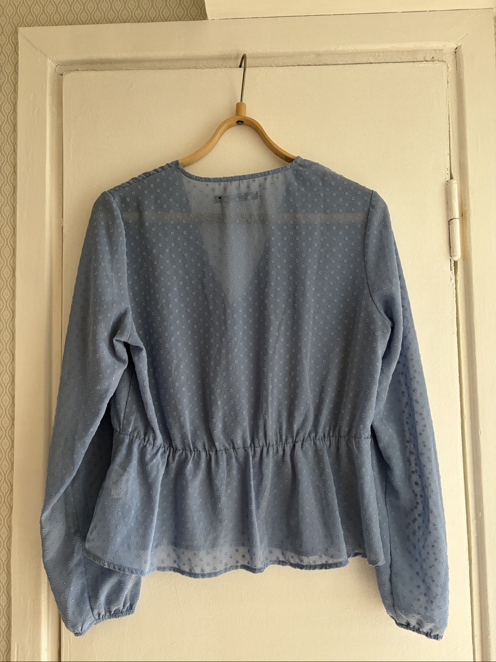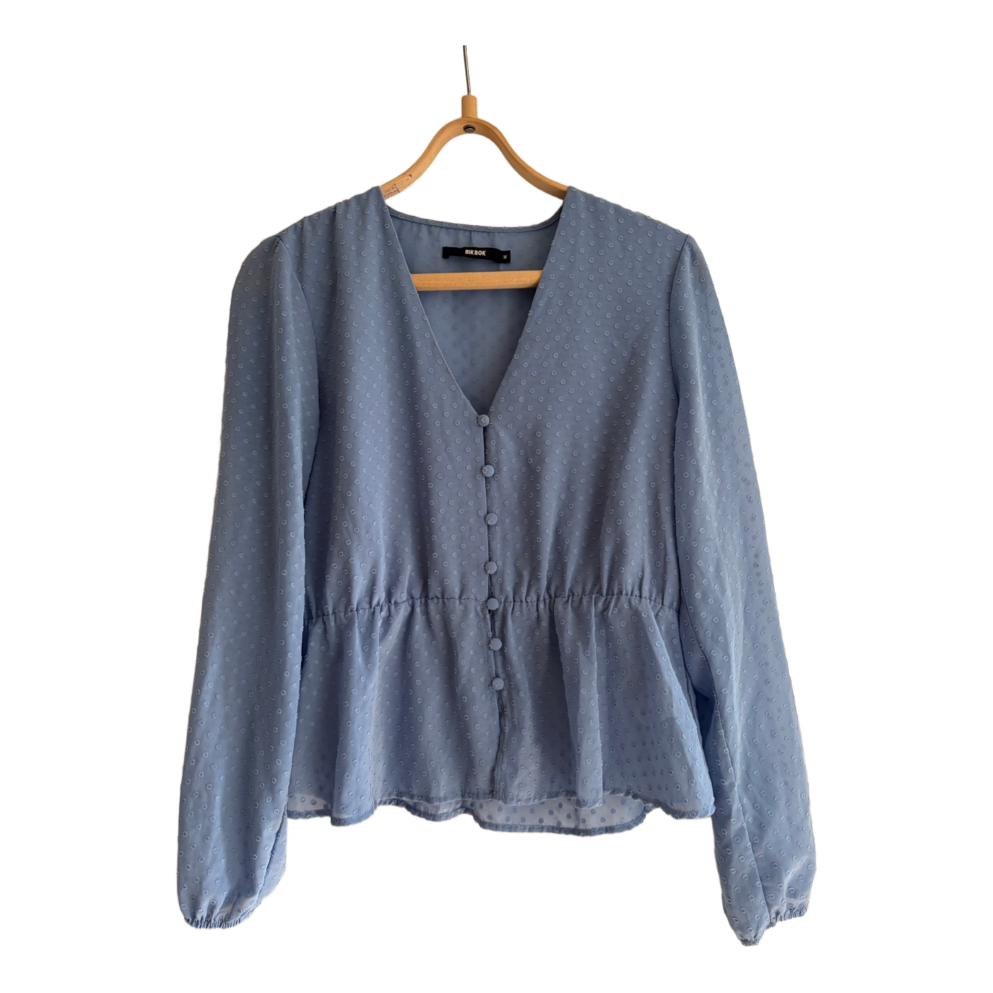 Blue long-sleeved blouse with a button-up front and a textured dot pattern. Features a cinched waist detail. Size M. From Bik Bok.