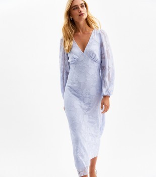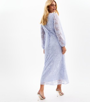 Midi length dress in light blue with floral textured pattern. Features long puff sleeves, a v-neckline, and a tie-back detail.