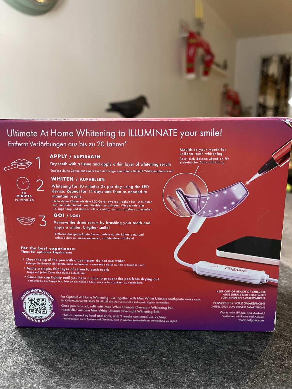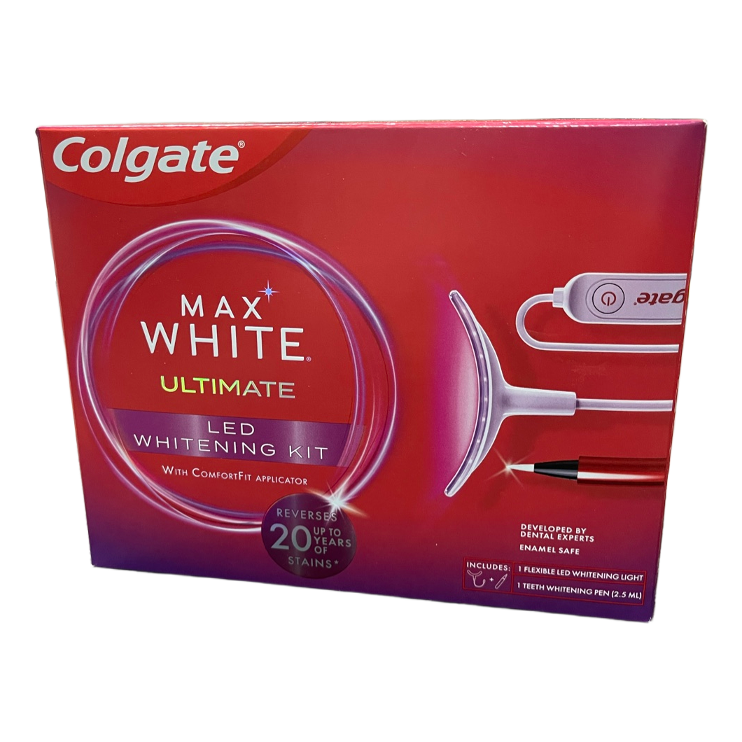 Colgate Max White Ultimate LED whitening set for teeth whitening. Contains a flexible LED light and a whitening pen.