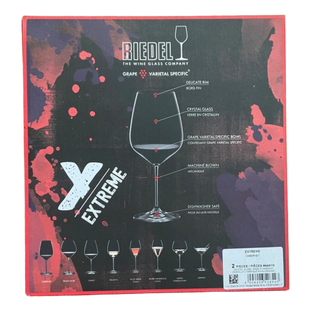 Riedel Extreme wine glasses are made of clear glass. The package contains wine glasses that are designed for serving wine. The shape of the glasses is intended to accentuate the wine's aromas and taste. Suitable for use with various wines at home or in table settings.