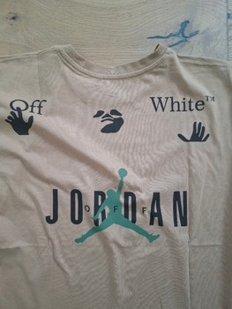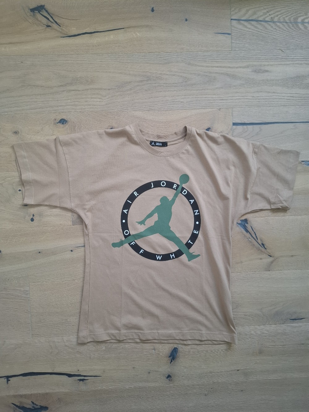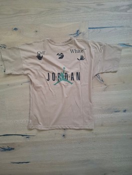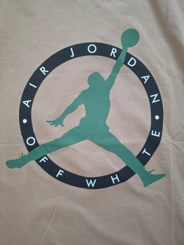 Beige t-shirt featuring a green Jordan and Off-White graphic logo on the front and back. Size S. S size is bigger