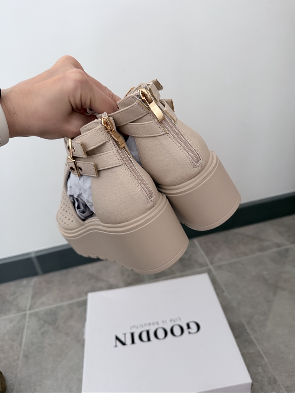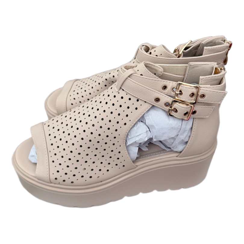 Beige platform sandals with a perforated design, buckled straps, and back zipper closure. Comes in original box.