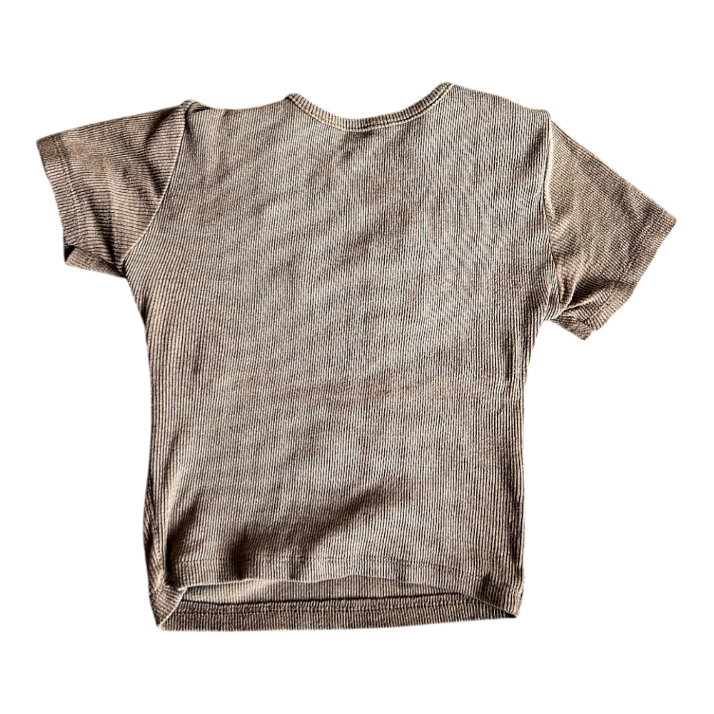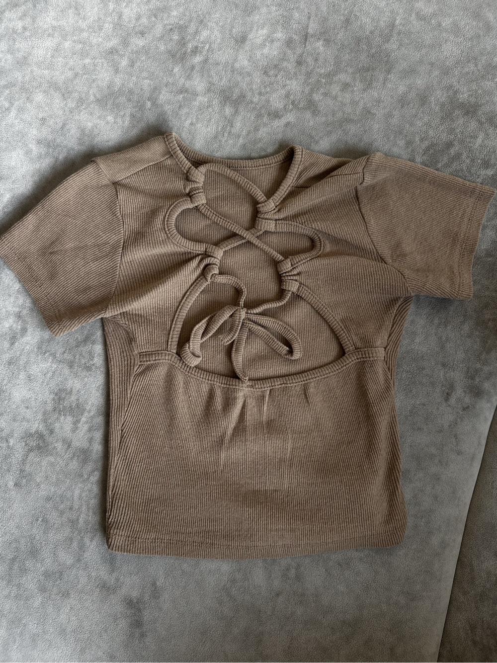 Short-sleeved top in a ribbed fabric, brown color. Features a decorative lace-up detail on the back.
