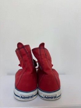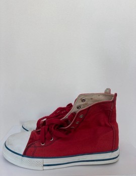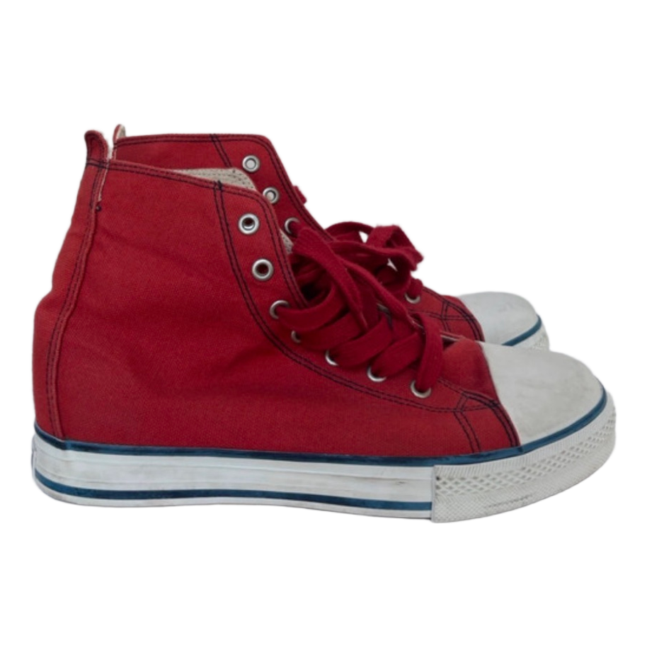 Red canvas sneakers with white rubber toe caps and rubber soles. Size 39.