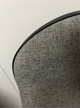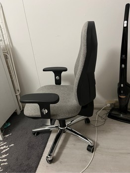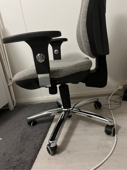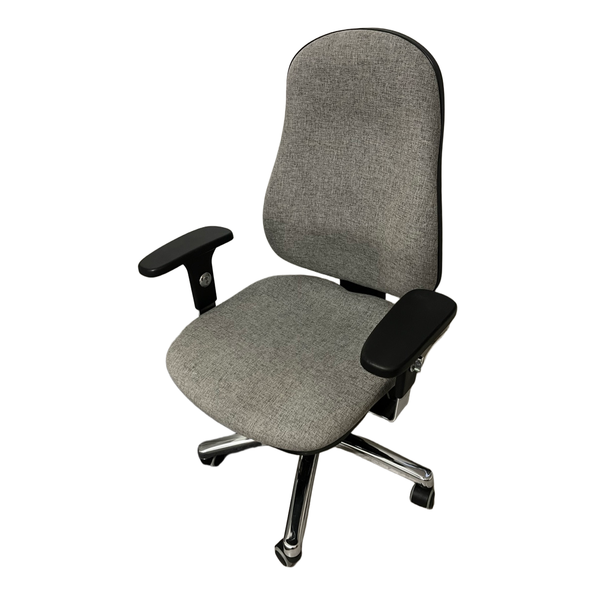 Office chair with grey fabric upholstery, black armrests, and a chrome five-star base with wheels.