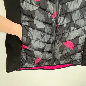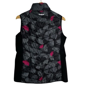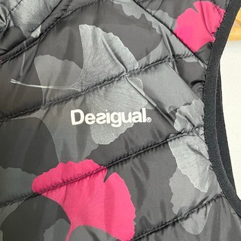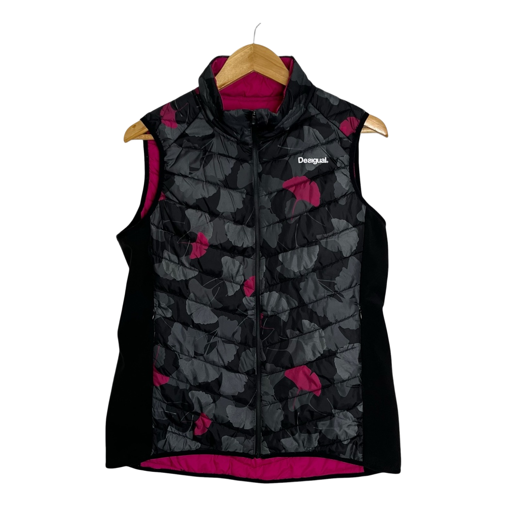 Desigual patterned padded vest with pink details. Zippered pockets.