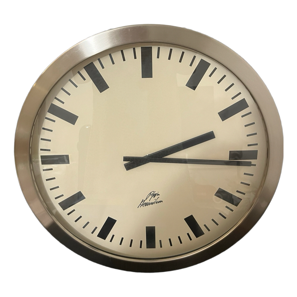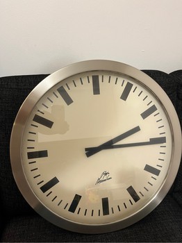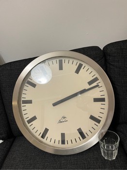 Large circular wall clock with a silver-tone frame and off-white dial. Features bold black hour and minute markers.