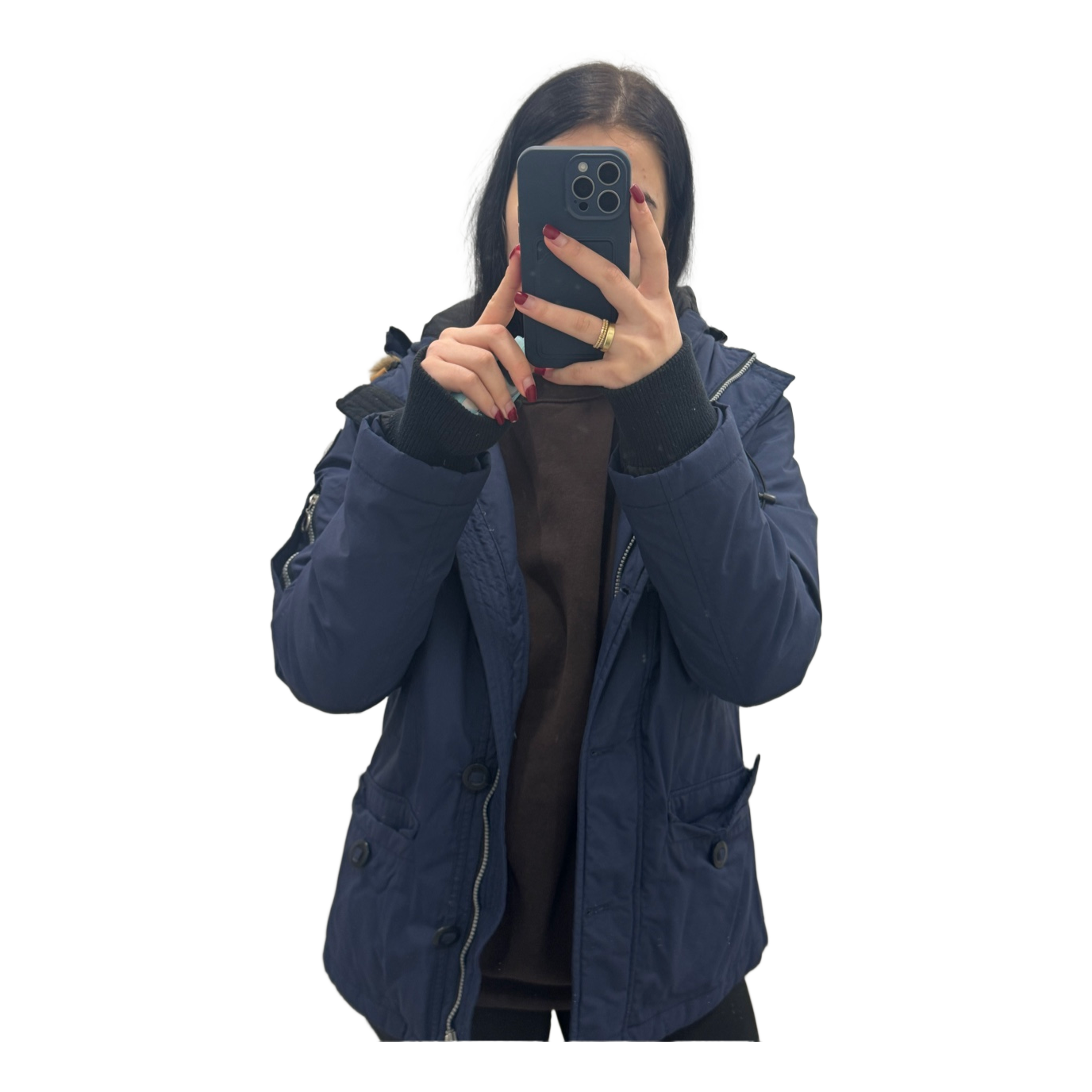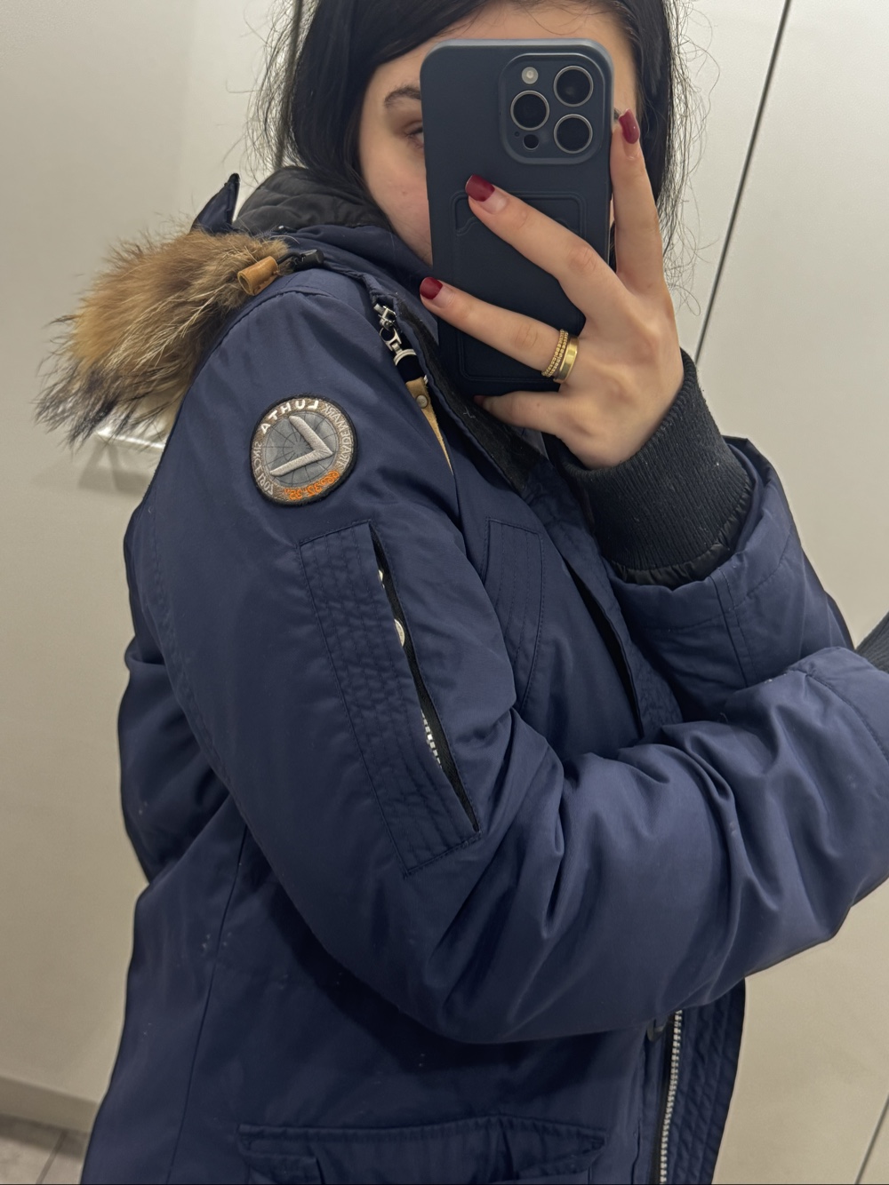 Navy blue winter jacket by Luhta with a fur-trimmed hood and sleeve detail.