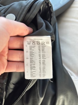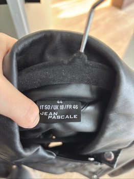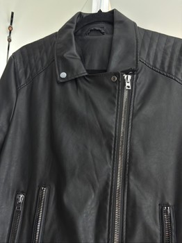 Black faux leather biker jacket with zip closures and quilted shoulder detail. Size 44.