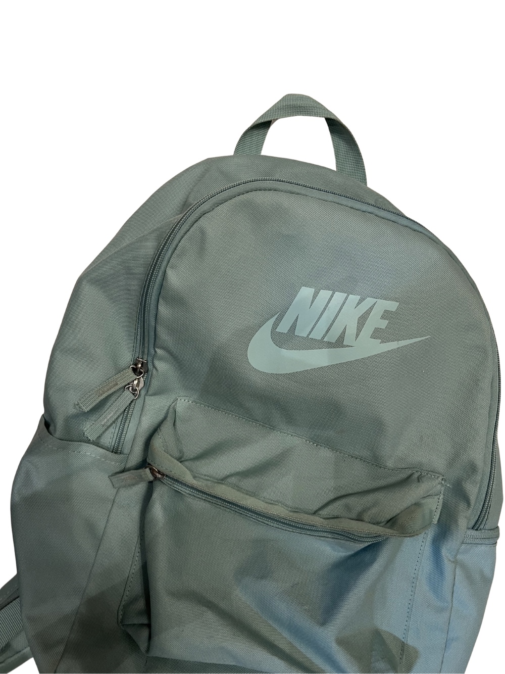 Mint Nike backpack with a front zipper pocket and logo detail.