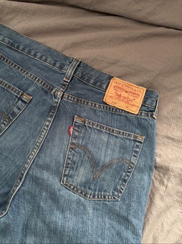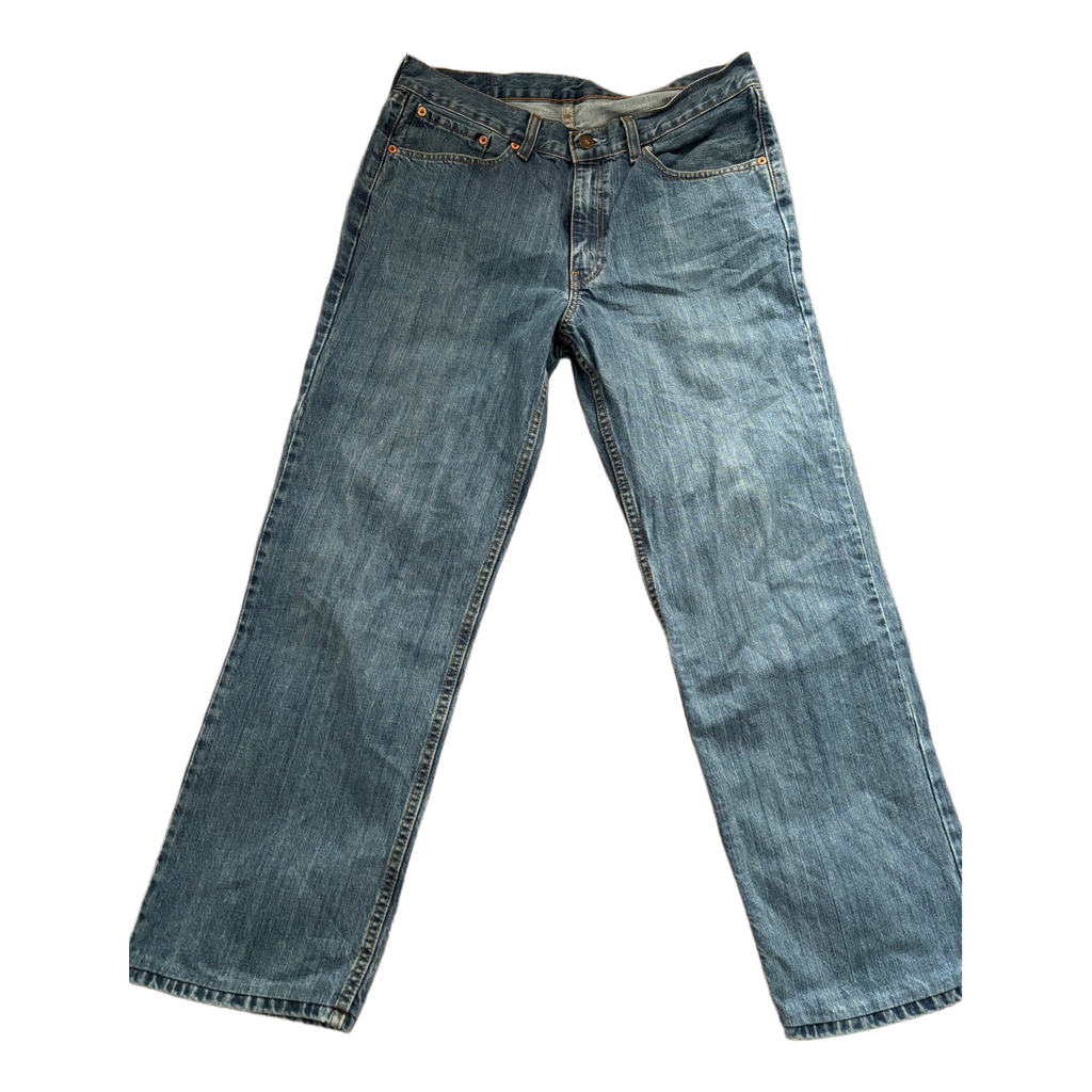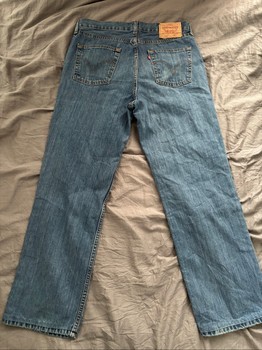 Blue denim jeans with classic five-pocket styling and leather brand patch. Size W34 L30.