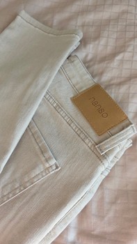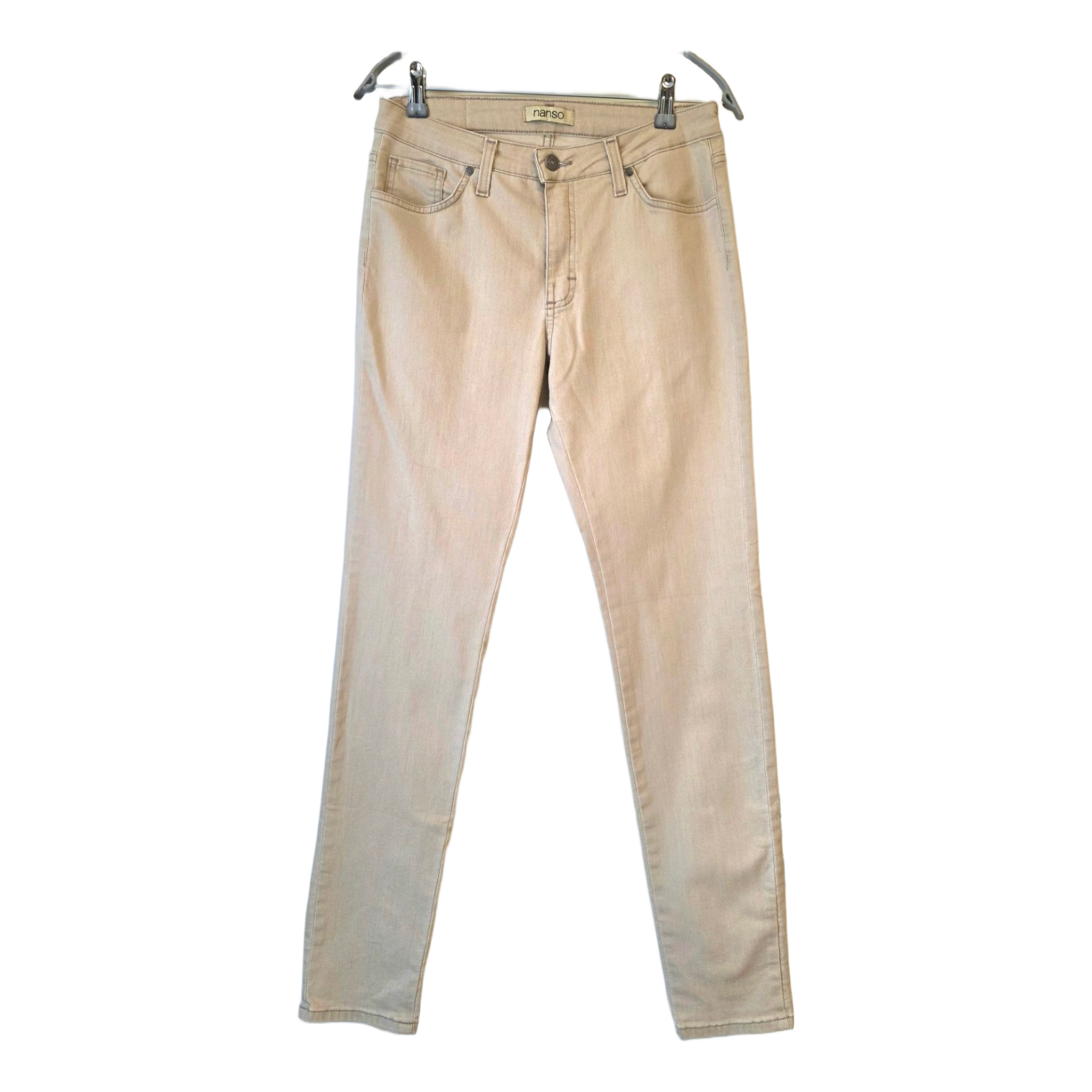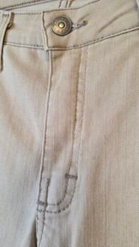 Beige trousers with a button closure. Size 38. Made of cotton, polyester, and elastane blend.
