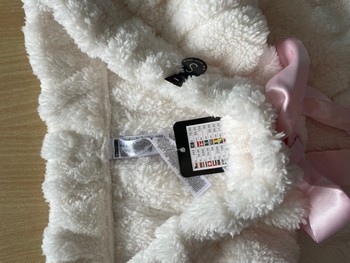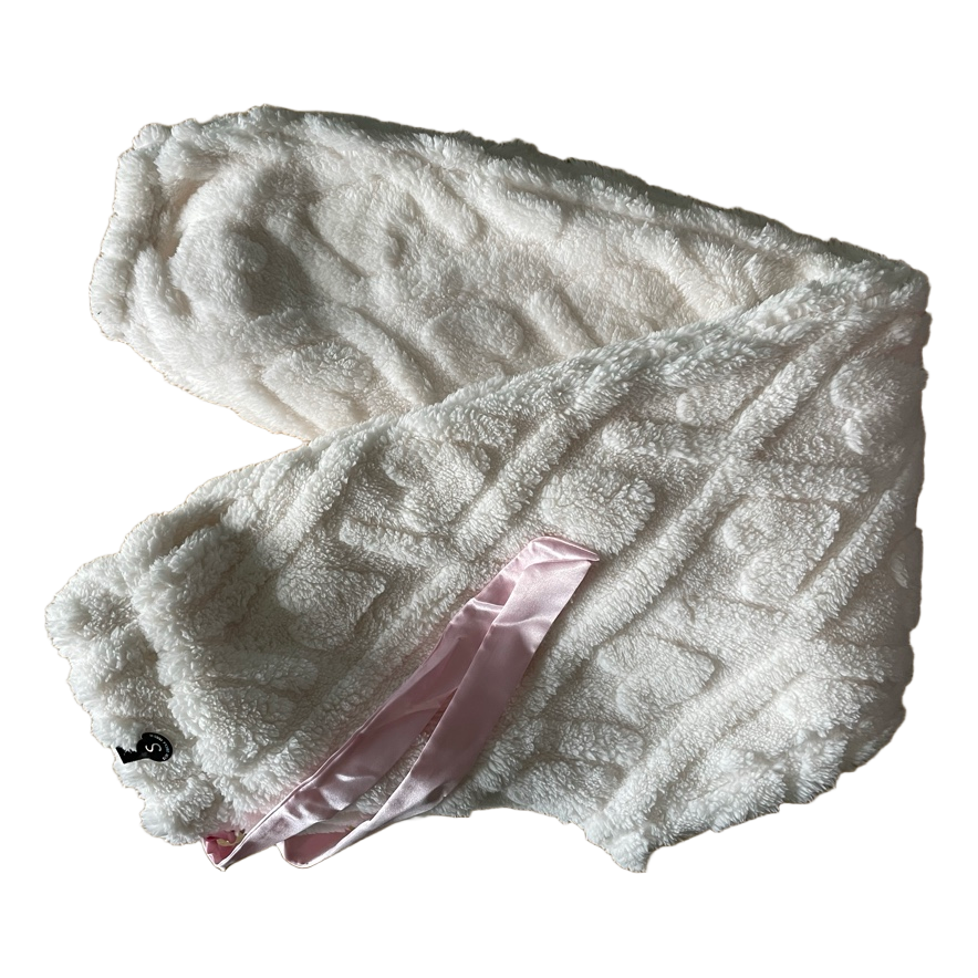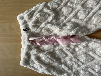 White lounge pants with a textured heart pattern. Features a pink ribbon drawstring. Size S.