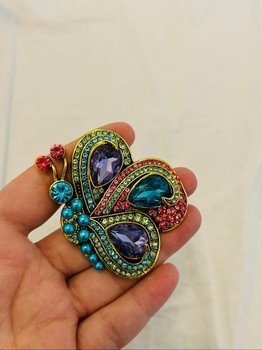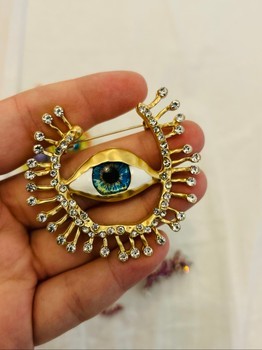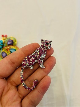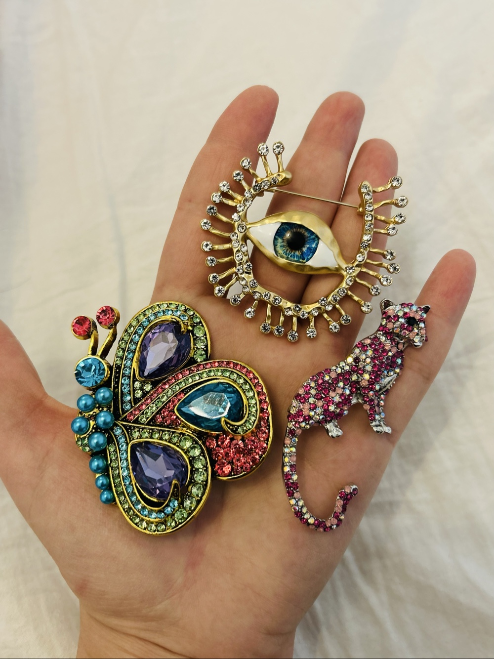 Set of three decorative brooches including a butterfly, a panther, and an eye design. Features colorful crystals and metal construction.