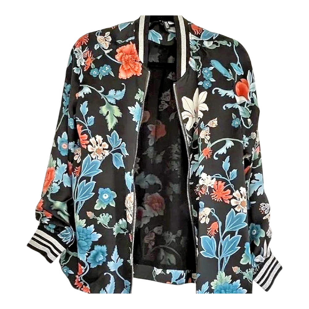 Black bomber jacket featuring a vibrant multicolor floral print. It has a full zip closure and striped cuffs and collar.