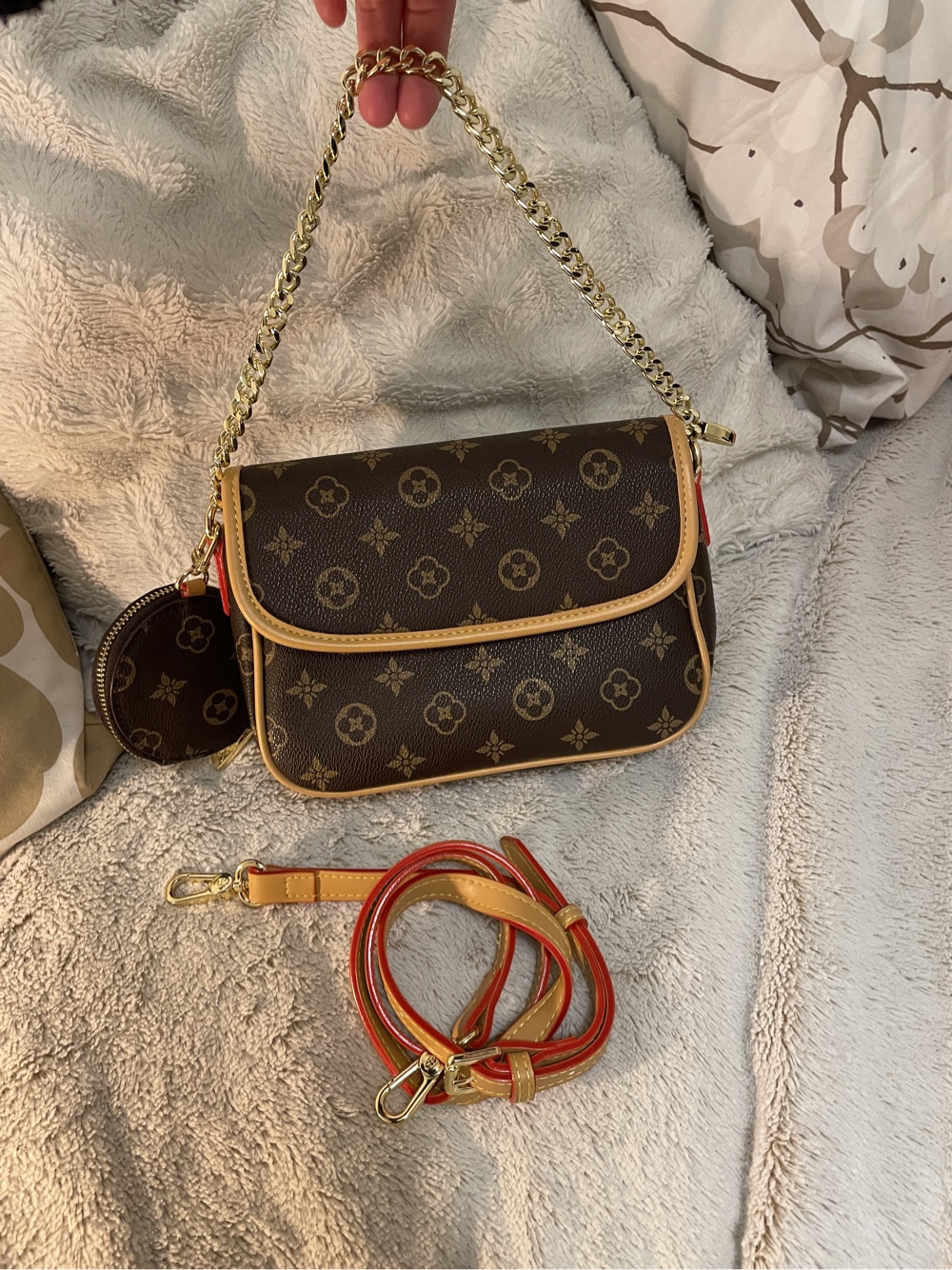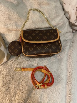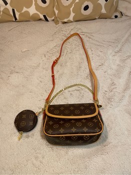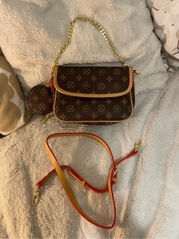 For sale: very good condition, used a couple of times monogram-patterned bag. Includes removable long strap and small coin purse / mini pouch for small items. The bag can be used as a handbag, shoulder bag and crossbody style. Inside there is a zip pocket and an open pocket. Closure with zipper and snaps. Color: brown/monogram pattern, gold-colored metal parts.