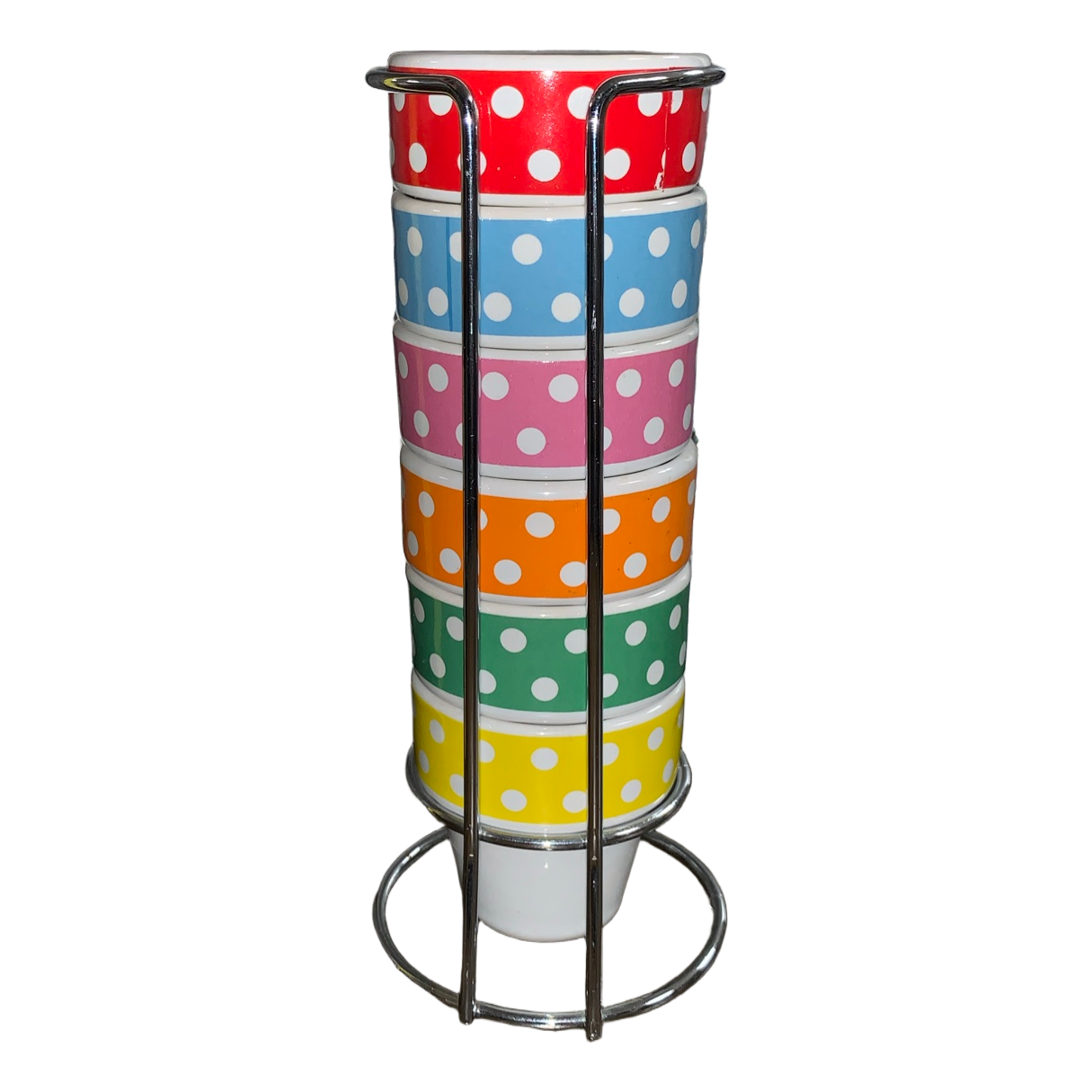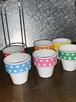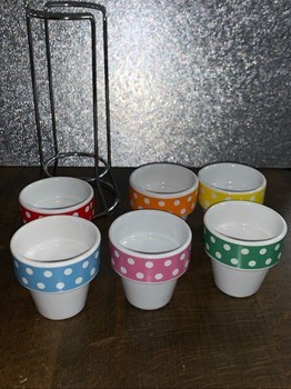 Set of six colorful ceramic egg cups with polka dot pattern. Includes a metal storage stand.