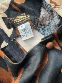 Beautiful domestic vintage rarity: Kaisu Heikkilä maxi dress from the 1970s. Size 40. Condition excellent, my own grandmother used this only once at a celebration. Material 100% cotton, wash 60°C. Made in Finland. The dress has a round neckline, shaped cut bodice, skirt flaring downwards. Measurements: length neck-seam to waist 38.5 cm, waist-hem 104 cm, waist width 40 cm, width at bust 50 cm, shoulder width 37 cm, hip width approx. 52 cm, hem width 105 cm, sleeve length from shoulder seam 63 cm, sleeve width at lower edge of shoulder puff/seam 16.5 cm, cuff width 12.5 cm, back from nape to top of bum 59 cm, zipper (plastic), decorative buttons at front. The dress is unlined.